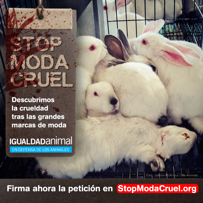 Después de llevar a cabo una investigación encubierta de dos años de duración en granjas de conejos de España, Igualdad Animal ha descubierto que numerosos diseñadores compran pieles obtenidas a base de métodos crueles y salvajes. Igualdad Animal lanza ahora una campaña para instar a estas firmas a que dejen de vender prendas fabricadas en piel. Igualdad Animal ha creado una página web StopModaCruel.org así como un vídeo con imágenes inéditas que muestra la brutalidad que se ejerce en estas granjas y declaraciones de Francisco Cuberes, responsable de la curtidora Curticub, y de Lidia Nogue, de la empresa Galaico Catalana, en la que manifiestan que venden pieles de conejo a grandes marcas de moda. Asimismo, ha publicado una petición para enviar a las compañías implicadas, entre las que se encuentran Burberry, Dior, Armani, Yves Saint Laurent, Louis Vuitton, Marc Jacobs, y Diane Von Furstenberg.