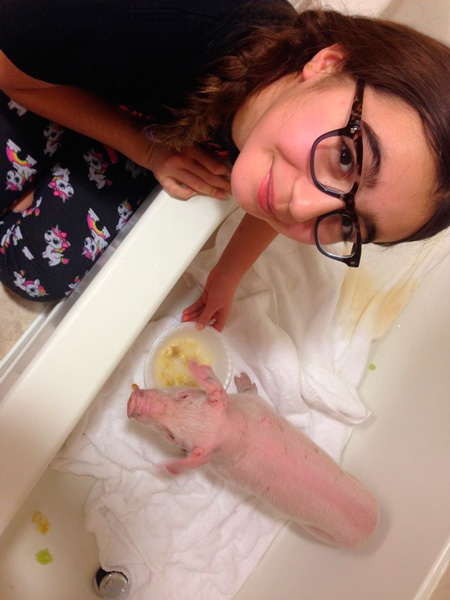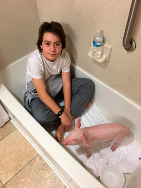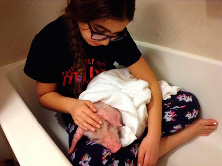 Catherine Smith, de 12 años, arropó con su propia ropa al pequeño y afortunado cerdito en el asiento de atrás del coche. Una vez en el hotel los Smith, al completo, se pusieron manos a la obra para reanimarlo.