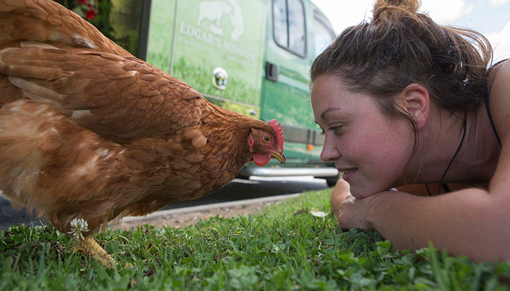 La brutal explotación que sufren día tras día hace que su salud se resienta y muchas de ellas mueran en las jaulas incluso antes de ser llevadas al matadero. Luego de recibir la llamada del granjero, el equipo de rescate de Edgard´s Mission se preparó para transportar con delicadeza a todas y cada una de las 1081 gallinas hacia una nueva vida donde conocerían por primera vez la libertad. Entre las rescatadas se encontraba una pequeña gallina que desde su llegada al refugio conquistó el corazón de todos. Un día, poco después de llegar, estaba echada sobre la hierba con sus alas extendidas en una de sus primeras oportunidades de recibir la luz de sol. Uno de los trabajadores dijo «mírala, le encanta el sol pero nunca lo había visto antes. Vamos a llamarla Pequeña Miss Sunshine». «Little Miss Sunshine era una de estas gallinas y su destino iba a ser el mismo que el resto de las 1080 gallinas que vivían con ella: sería enviada al matadero cuando su producción de huevos mermara luego de una triste vida en la que solo conoció el sufrimiento». Alegre y resplandeciente, Little Miss Sunshine se ha convertido en la embajadora de miles de millones de gallinas. Ella es la esperanza de un mundo mejor para todos los animales, porque no solo es posible sino que de forma imparable lo estamos construyendo.
