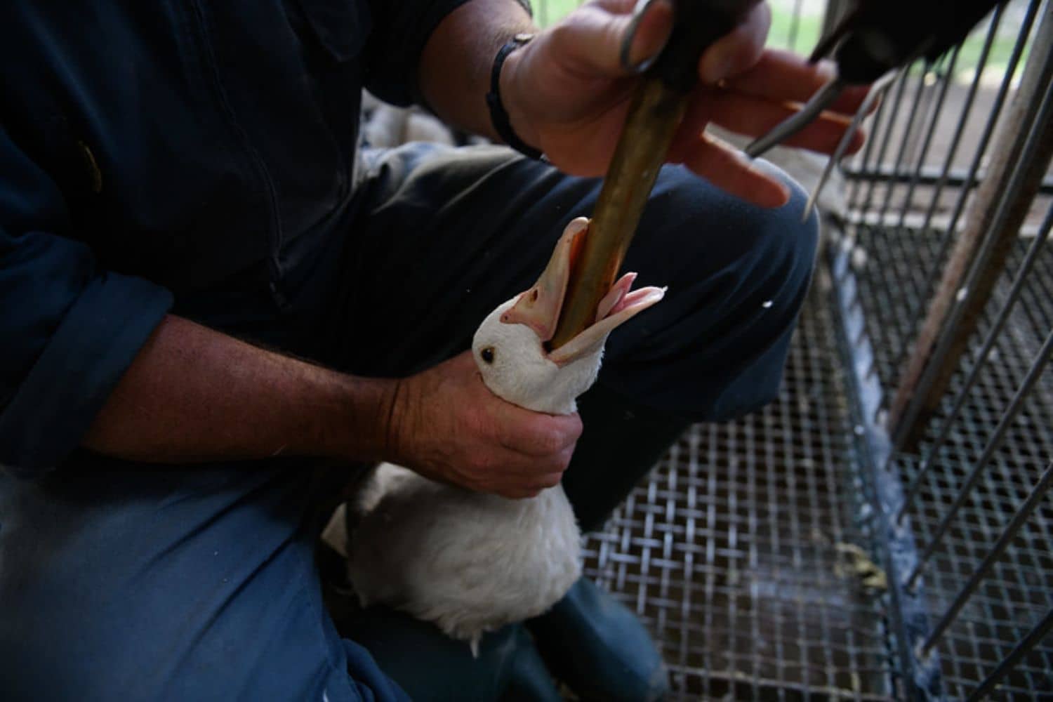 2. Alimentación forzada: los patos son obligados a ingerir cada día hasta 2 kilos de pasta de maiz, introduciendo un tubo de metal de 30 centímetros por su esófago.