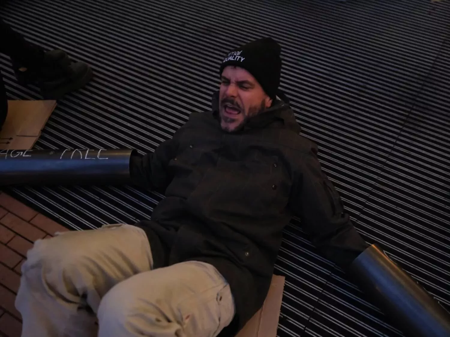 La policía llegó al lugar poco después del inicio de la acción, advirtiendo que todas las personas presentes podían ser arrestadas, independientemente de si seguían encadenadas o no. Pero no nos detuvimos.
