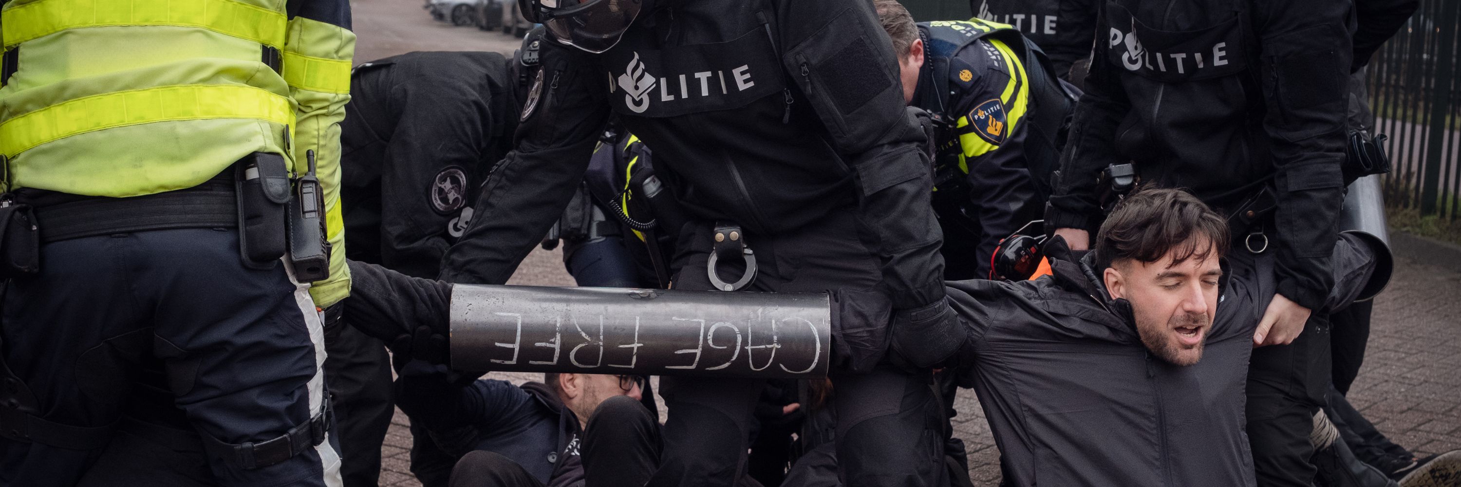 Activistas por los derechos de los animales fueron arrestados el pasado 13 de enero tras encadenarse frente a las oficinas centrales de Ahold Delhaize, una de las mayores multinacionales del sector alimentario. Le exigen a la empresa que cumpla su promesa para eliminar las jaulas en su cadena de suministro y ponga fin al maltrato animal sistemático.