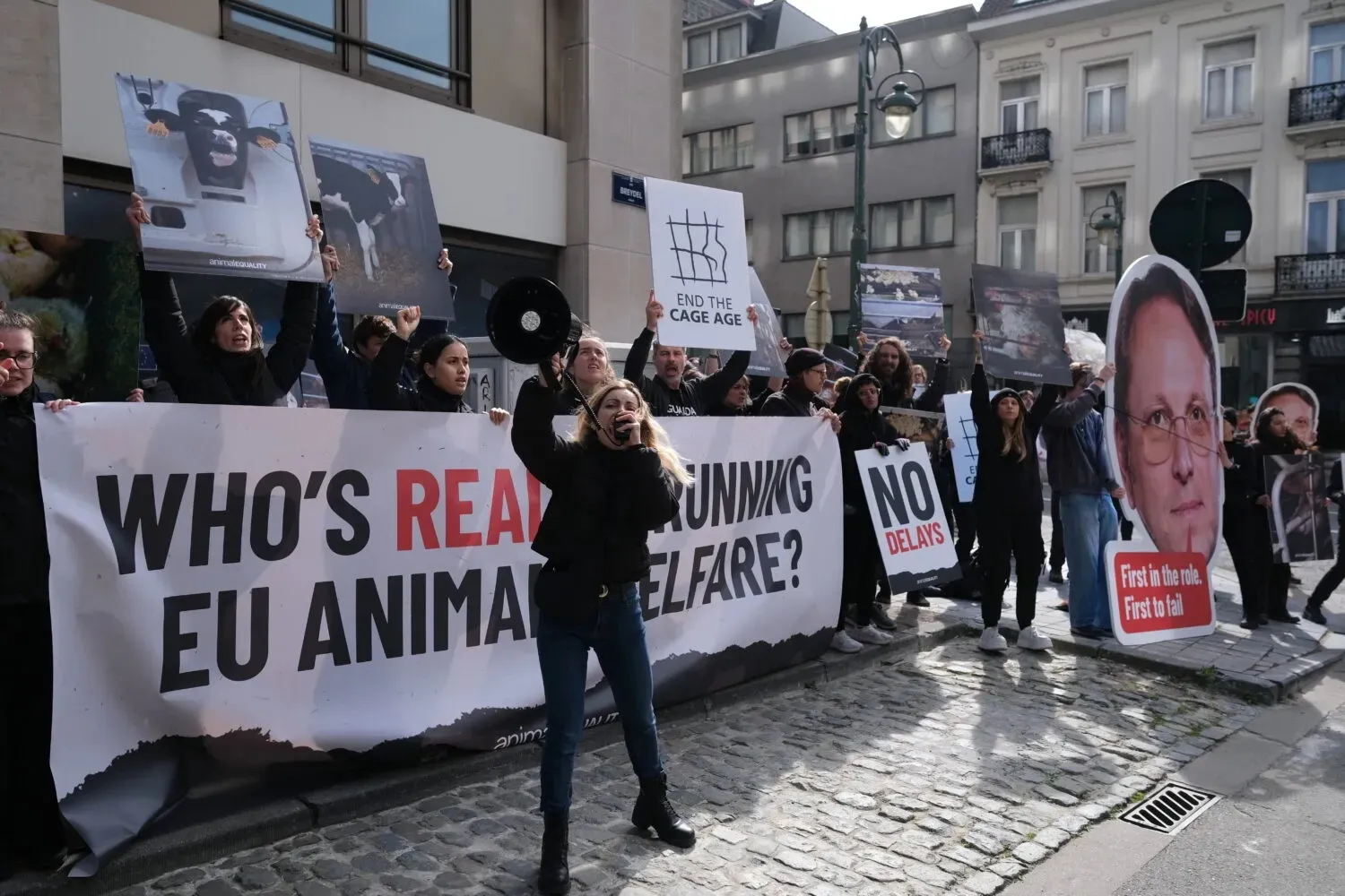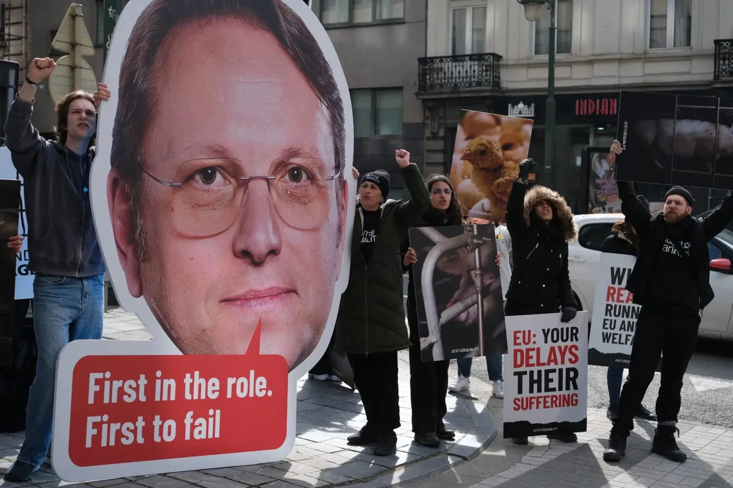 Los enormes retratos de Várhelyi, Hansen y Von der Leyen presidieron la escena como responsables del inmovilismo actual, mientras 300 millones de animales siguen malviviendo en jaulas en todo el continente.