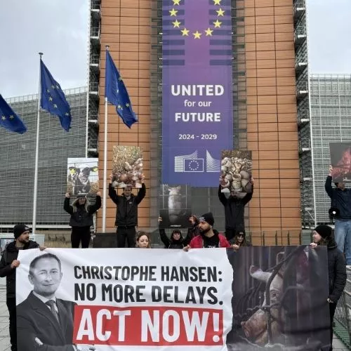 Activistas protestan ante la Comisión Europea tras años de promesas incumplidas, exigiendo reformar de inmediato las leyes de protección animal, con prohibición total de jaulas y fin de la matanza de pollitos machos.